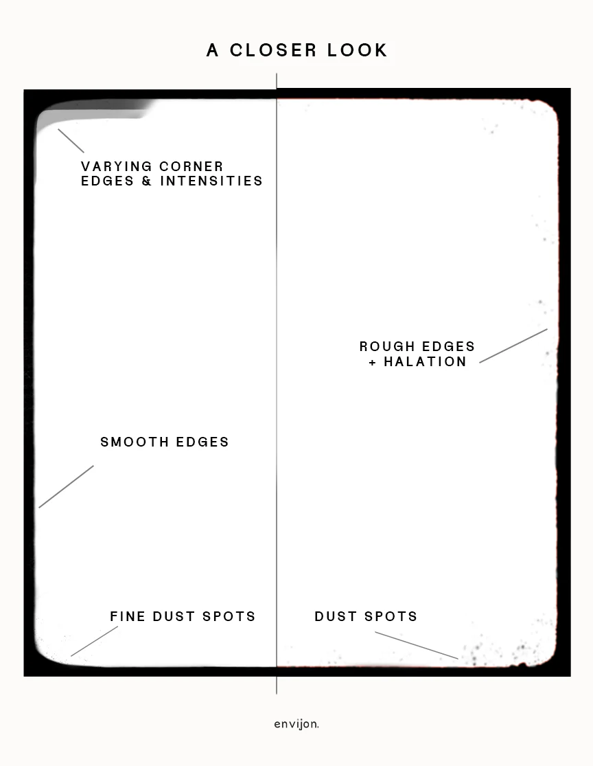 Lấy cảm hứng từ phim 8mm và 16mm, các đường viền có nhiều kiểu dáng và hình dạng cạnh khác nhau. Có một lựa chọn cho mọi dự án. Biến đổi hình ảnh của bạn trong vài giây. Chỉ cần kéo và thả lớp phủ vào dòng thời gian của bạn.