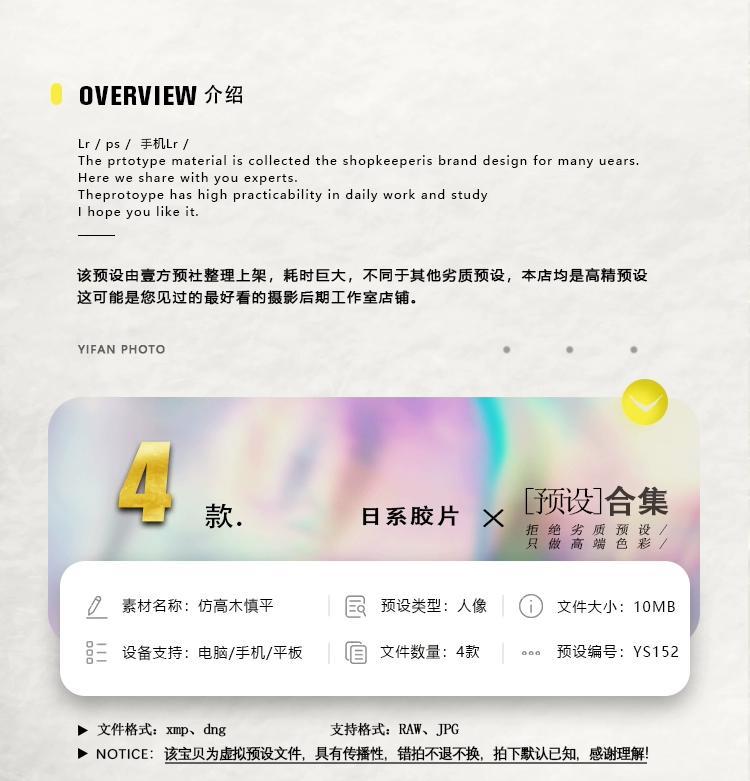 Gói này có thể dành cho ảnh chụp mùa xuân, tết và lễ hội phong cách Nhật Bản. Một cài đặt trước ban đầu của nhiếp ảnh gia Curbon, người nổi tiếng với những bức ảnh có bầu không khí nhìn vào các tạp chí thời trang ở nước ngoài, đã ra đời. Với cài đặt trước này, bạn có thể tạo ra một bức ảnh có bầu không khí, cho dù đó là ảnh hàng ngày hay tác phẩm bạn đã tạo.Tôi muốn chỉnh sửa với một màu sắc như Takagi, nhưng tôi nghĩ rằng có nhiều người không thể chỉnh sửa tốt. Cài đặt trước này cũng được khuyến nghị cho ảnh cưới, ảnh thời trang và ảnh du lịch.Hãy thử nó với ảnh của riêng bạn.